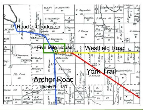 Three major roads converged at the Five Mile House. While traveling the Eighth Judicial Circuit, Abraham Lincoln rode the York trail twice which brought him by the Five Mile House in the spring and again in the fall.